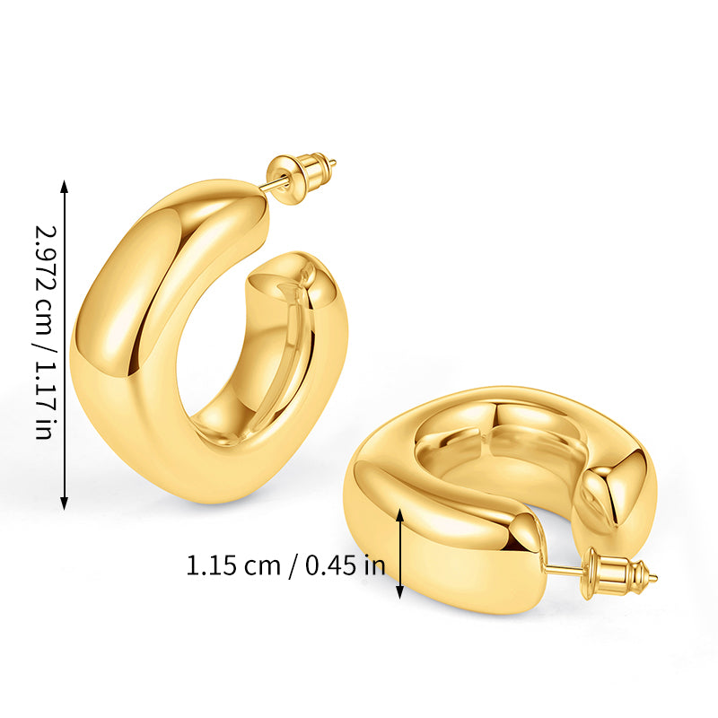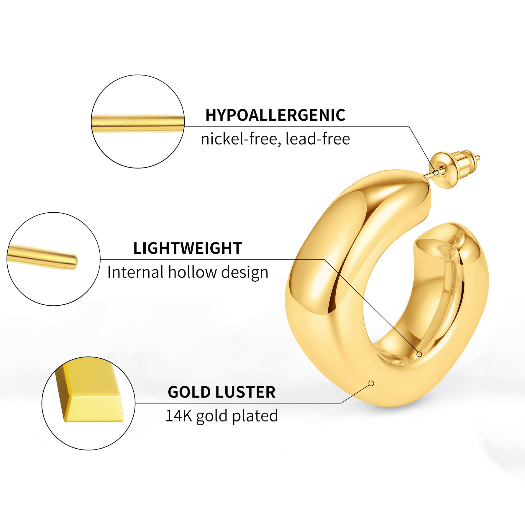 Hypoallergenic Earrings: This thick goldenen hoop earring is made of 14K golden-plated brass, which is hypoallergenic, lead-free and nickel-free, and can be worn comfortably on sensitive ears without peeling and fading.