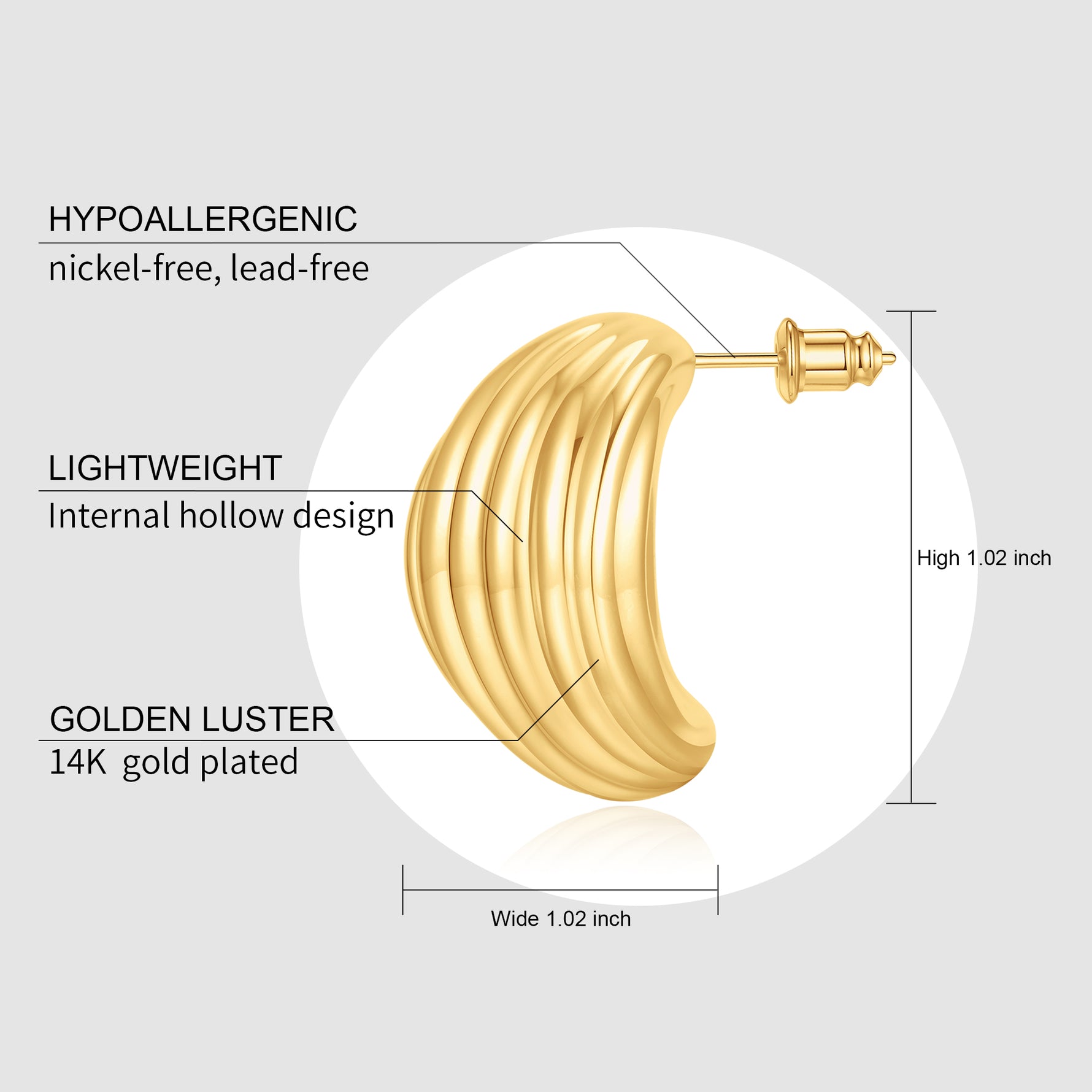 【Lightweight Design】The thick golden earrings adopt a super lightweight design concept, and there will be no discomfort when wearing them for a long. The thick hoop earrings are very suitable for daily wear. The large golden earrings highlight different styles. [Low Allergy, Lightweight and Comfortable] The light golden are made of copper, plated with 14k golden, low allergy, no nickel, no lead. The thick golden earrings are very friendly to women with sensitive. The golden earrings will not lose their luster and can be worn every day. [Earring Size] The size of the thick golden earrings is 1.*0.9 inches. The inside of the women's earrings is hollow, very lightweight. The thick golden earrings have a simple design style, which is very suitable daily life, work, gatherings, etc. [Special Gift] The earrings can be given to mothers, wives, daughters as a unique gift on Christmas, anniversary,'s Day, Mother's Day and birthday. No woman doesn't like.