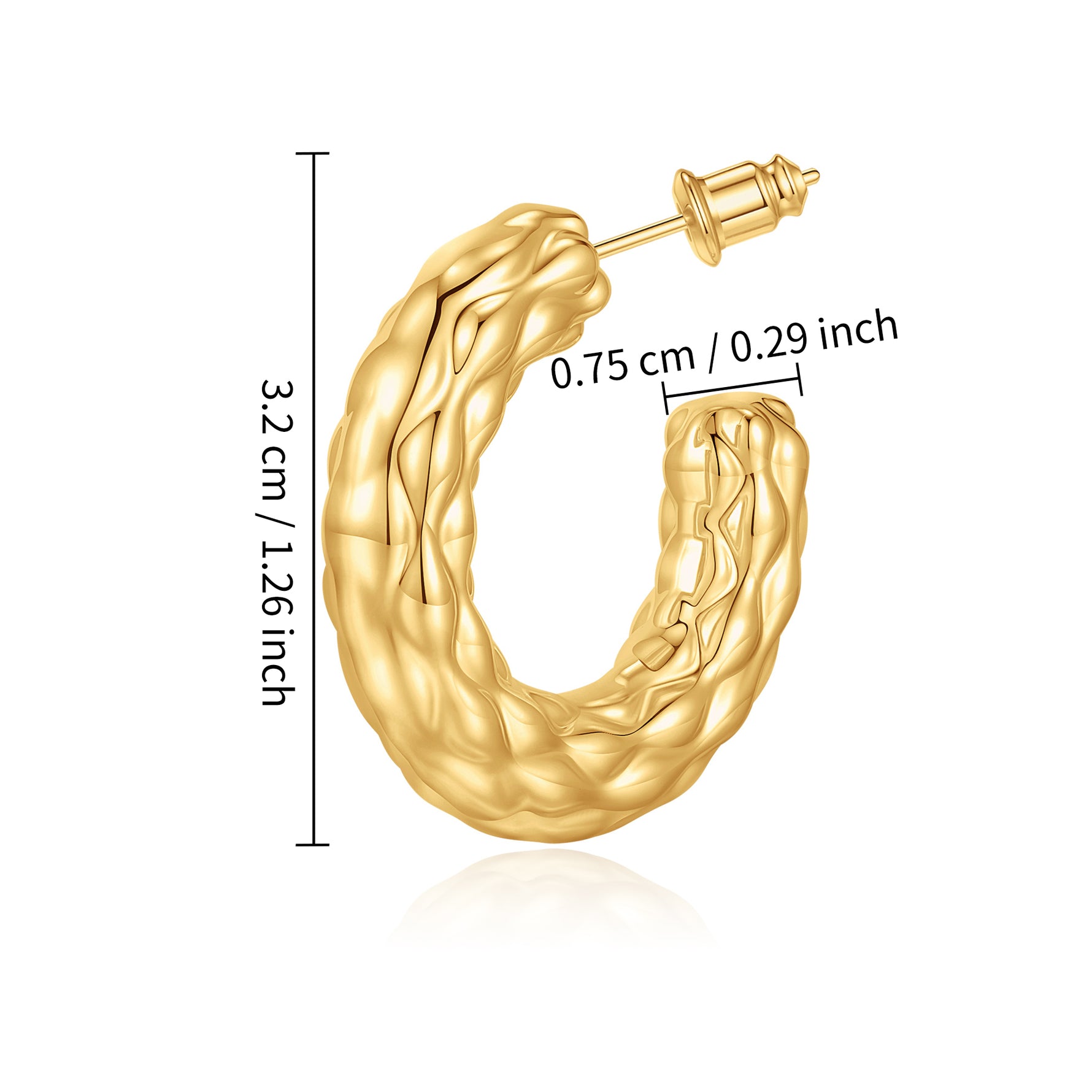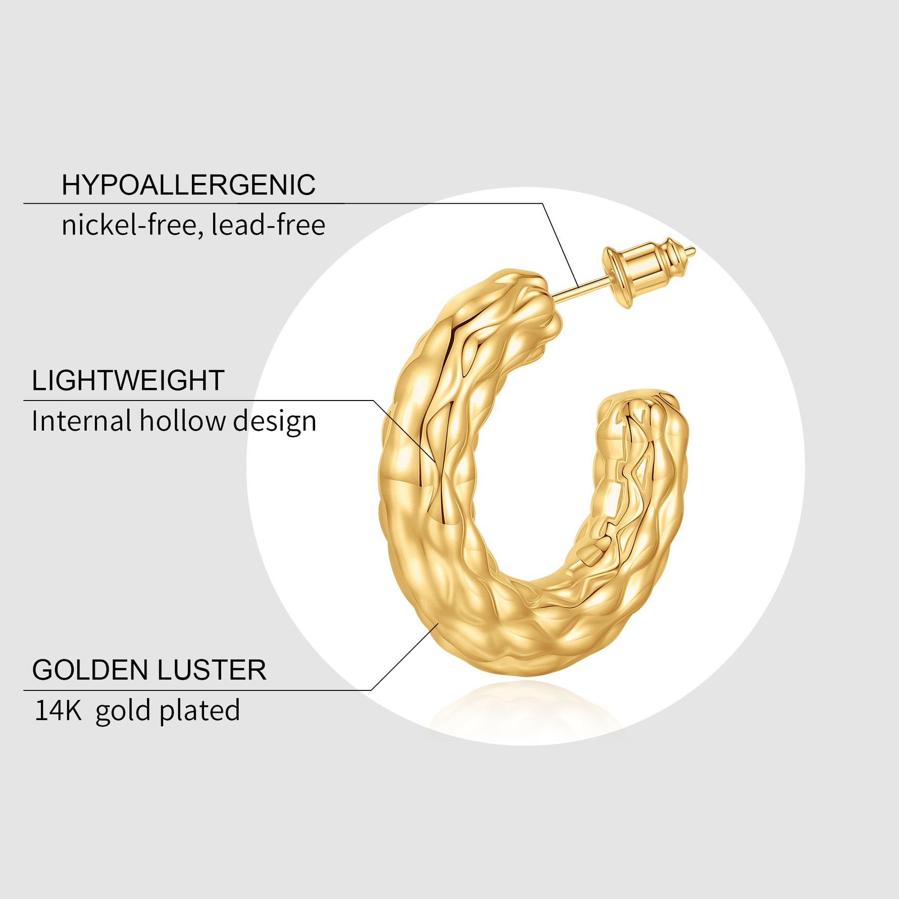 【Lightweight Design】The thick golden earrings adopt a super lightweight design concept, and there will be no discomfort when wearing them for a time. The thick hoop earrings are very suitable for daily wear. The large golden earrings highlight different styles. [Low Allergy, Lightweight and Comfortable] The light earrings are made of copper, plated with 14k golden, low allergy, no nickel, no lead. The thick golden earrings are very friendly to women with sensitive. The golden earrings will not lose their luster and can be worn every day. [Earring Size] The thick golden earrings are 1.22 inches The inside of the women's earrings is hollow, very lightweight. The thick golden earrings have a simple design style, which is very suitable for daily life, work,, etc. [Special Gift] The earrings can be given to mothers, wives, daughters as a unique gift on Christmas, anniversary, Valentine's Day, Mother's and birthday. No woman doesn't like this pair of beautiful thick golden earrings.