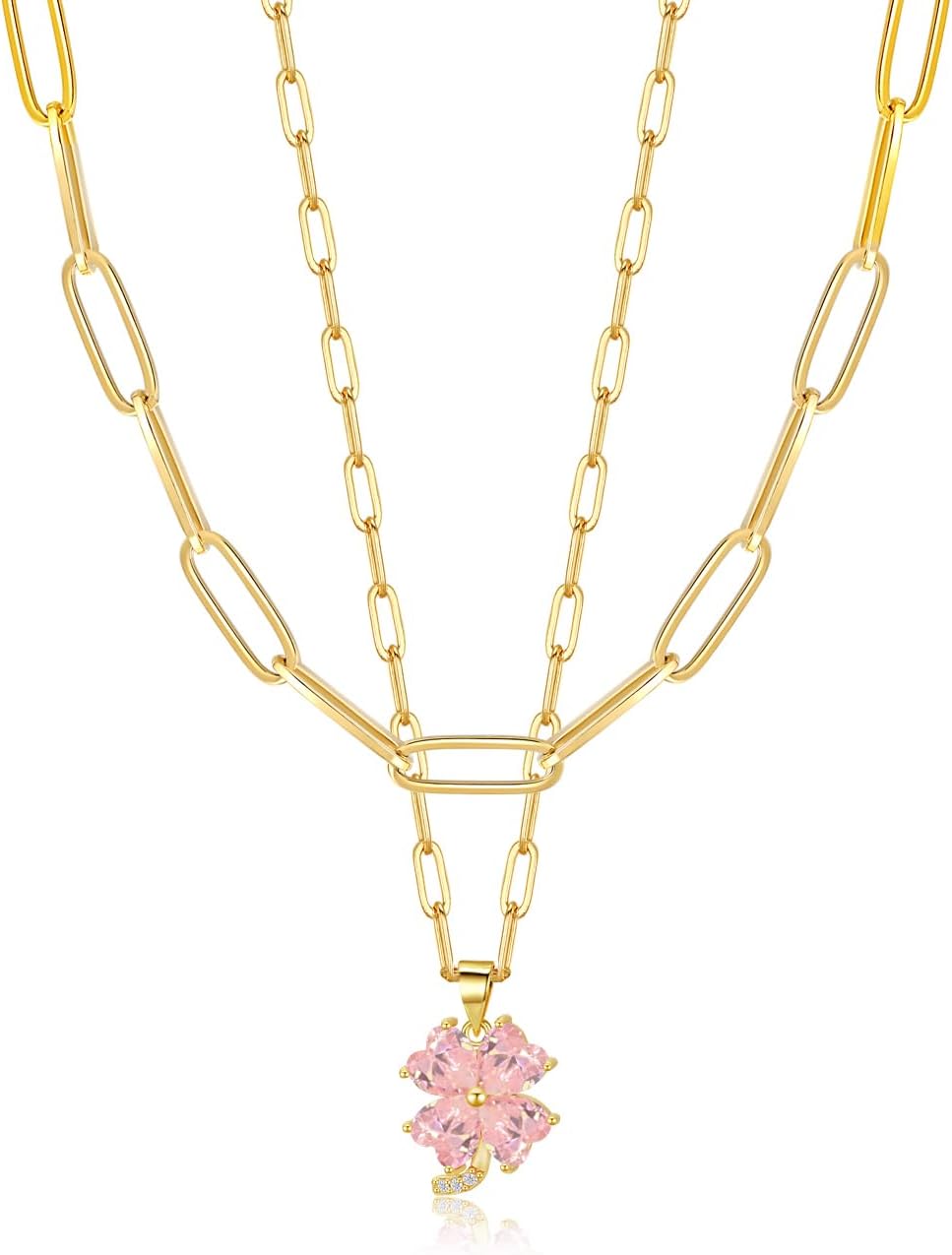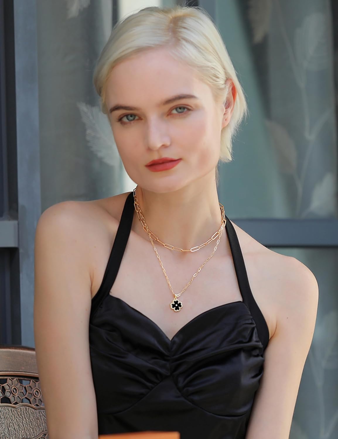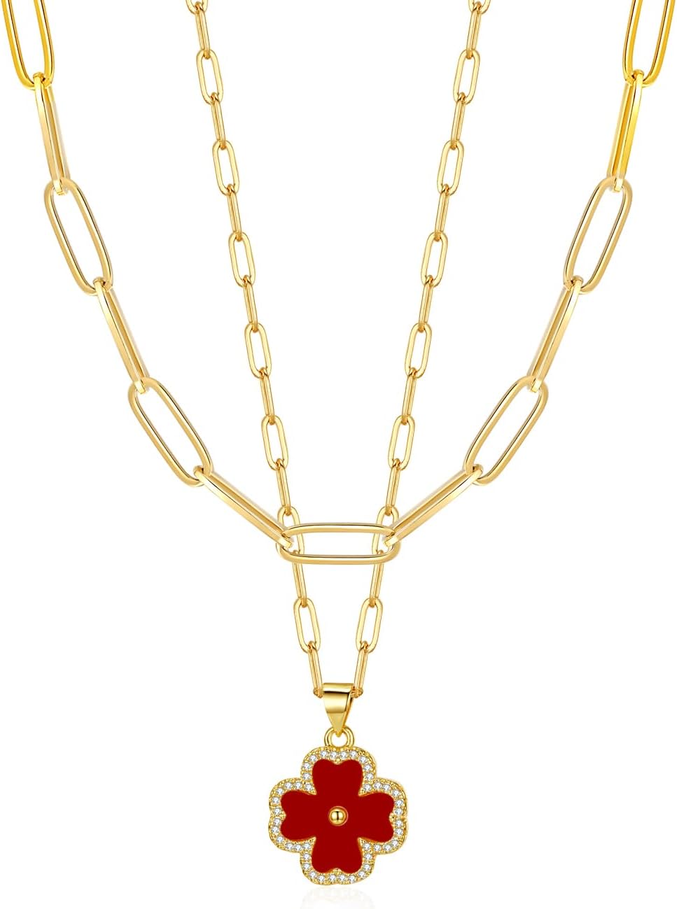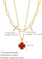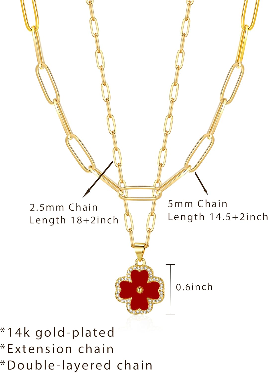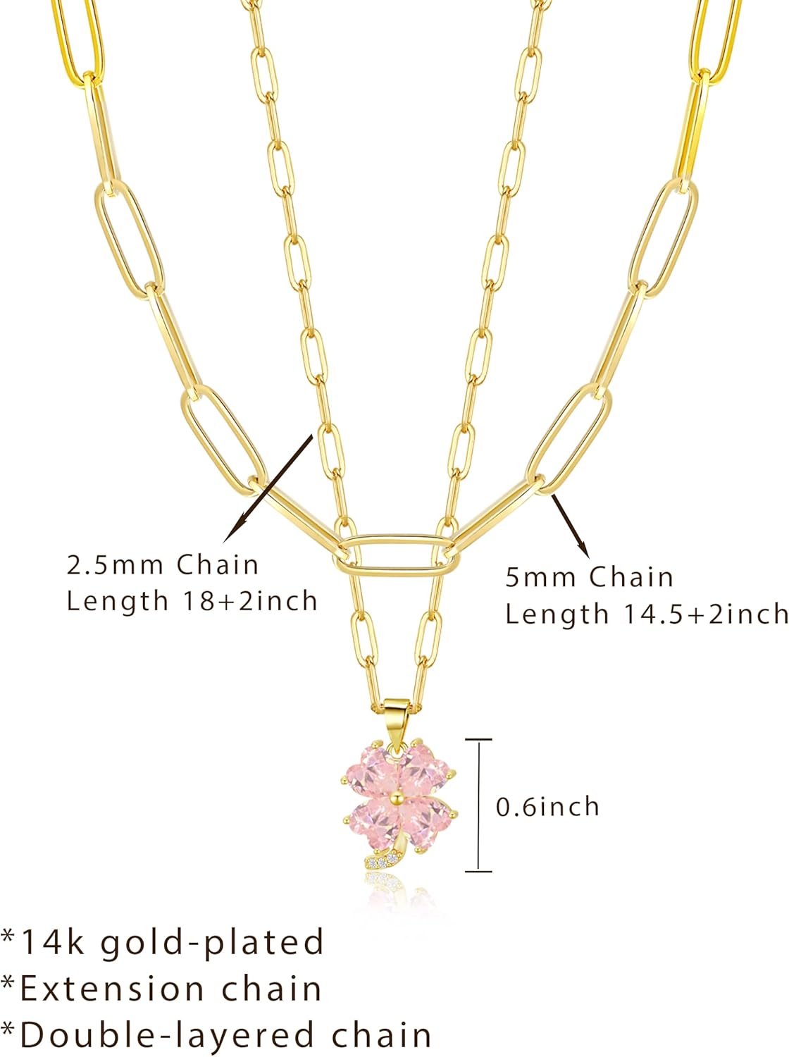 Four Leaf Clover Pendant Necklace Double Layer Chain 14K Gold Plated Birthday Valentine's day Jewelry Gift for Women Wife