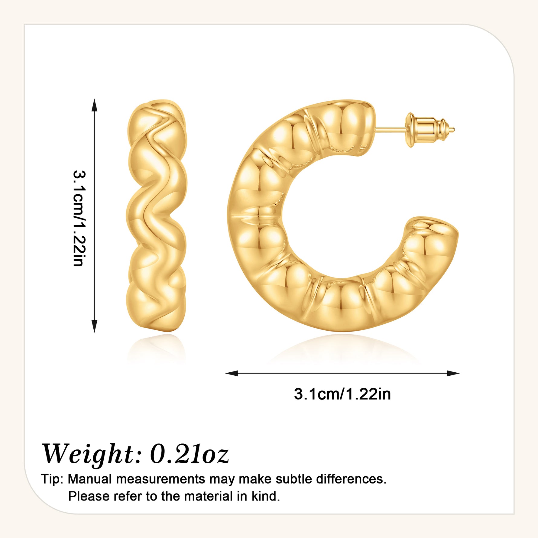 Size: This heavy goldenen ring earring is 1.22*1.22 inches in size, with hollow tubular design, comfortable to wear and very light. This is a lovely, interesting and beautiful ring earring.