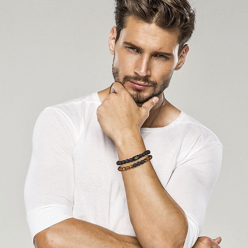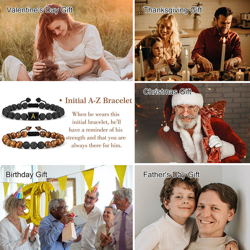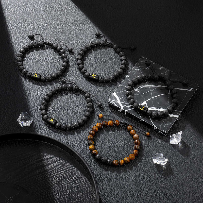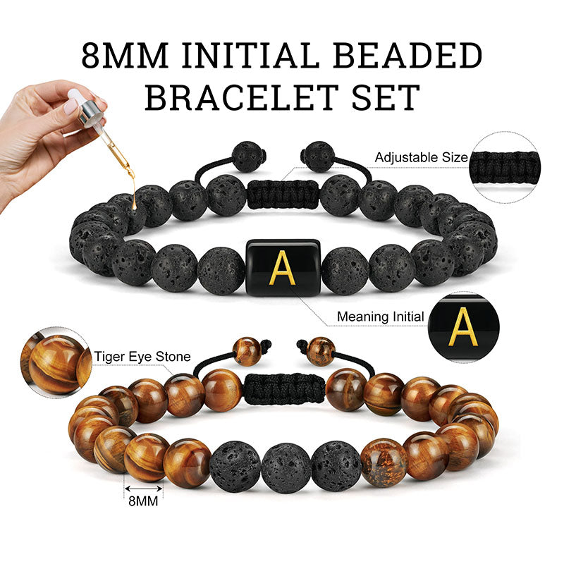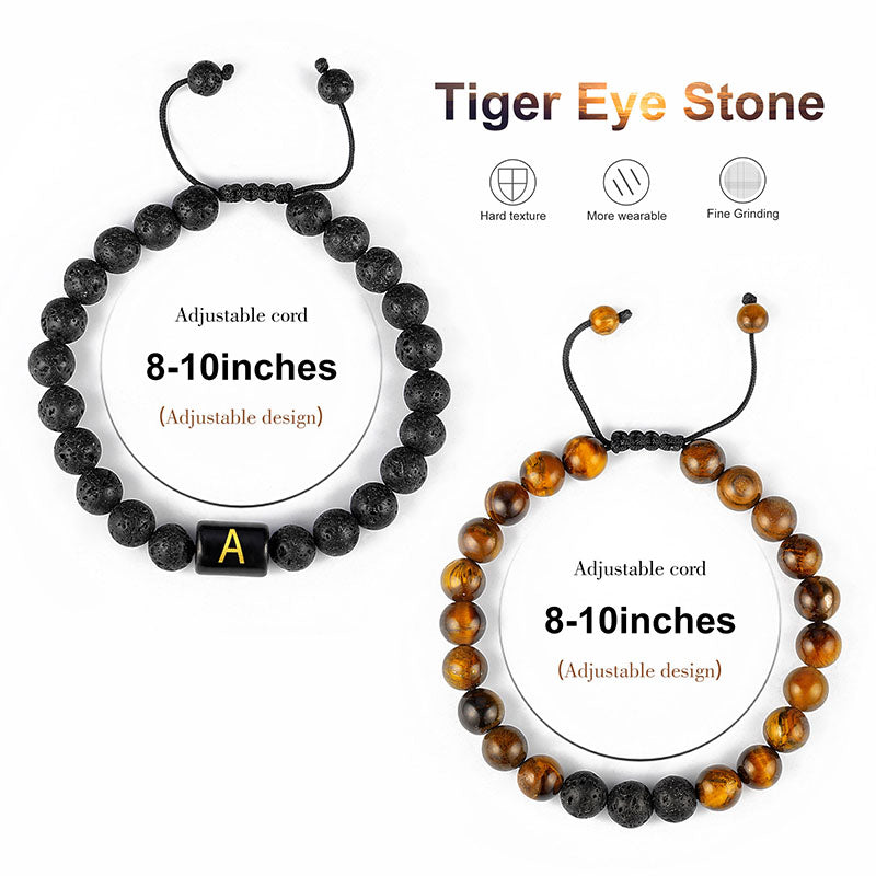 SIZE&MATERIAL: Mens beaded bracelet features an adjustable cord with an internal from 8 inches to 10 inches. Made of 8mm tiger eye beads + 8mm lava rock beads + 26 letter cylindrical bead. No metal, it can be worn with sensitive skin, The strong string is durable to use in daily life. You can wear alone or pair with other bracelets for a modern and dapper look.