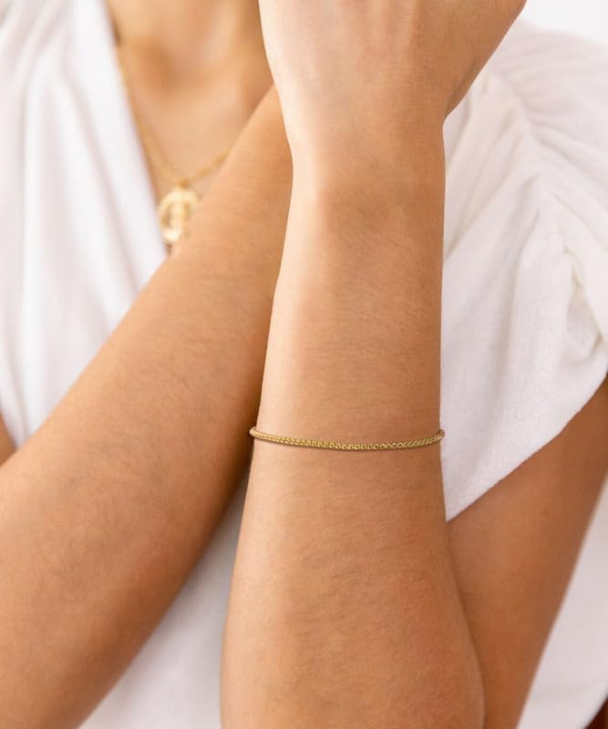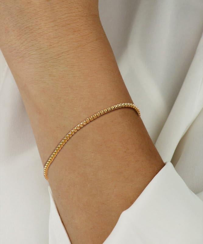 Modern Elegance Gold Bracelet -The box chain bracelet is plated with extra thick real gold. Hypoallergenic, nickel and lead free, safe to wear and suitable for sensitive skin. Solid 925 sterling silver lobster clasp, low-key yet luxurious, highly polished, strong, durable. Diamond-cut beveled links are much more reflective, more perfect shine.